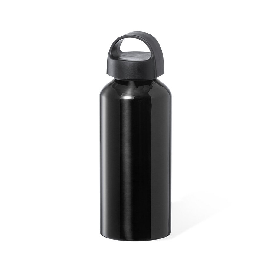 Bidon d'une capacité de 500 ml, en aluminium avec une finition brillante. Bouchon à vis noir avec poignée intégrée, sans BPA. Disponible dans une large gamme de couleurs et présenté dans une boîte individuelle en kraft design.