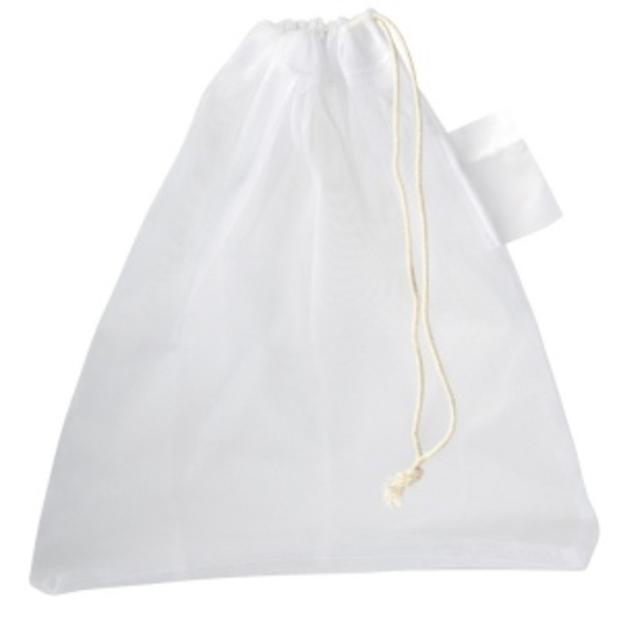 Filet à légumes : matière recyclée, refermable avec un cordon, lavable, réutilisable, avec étiquette pour l´impression