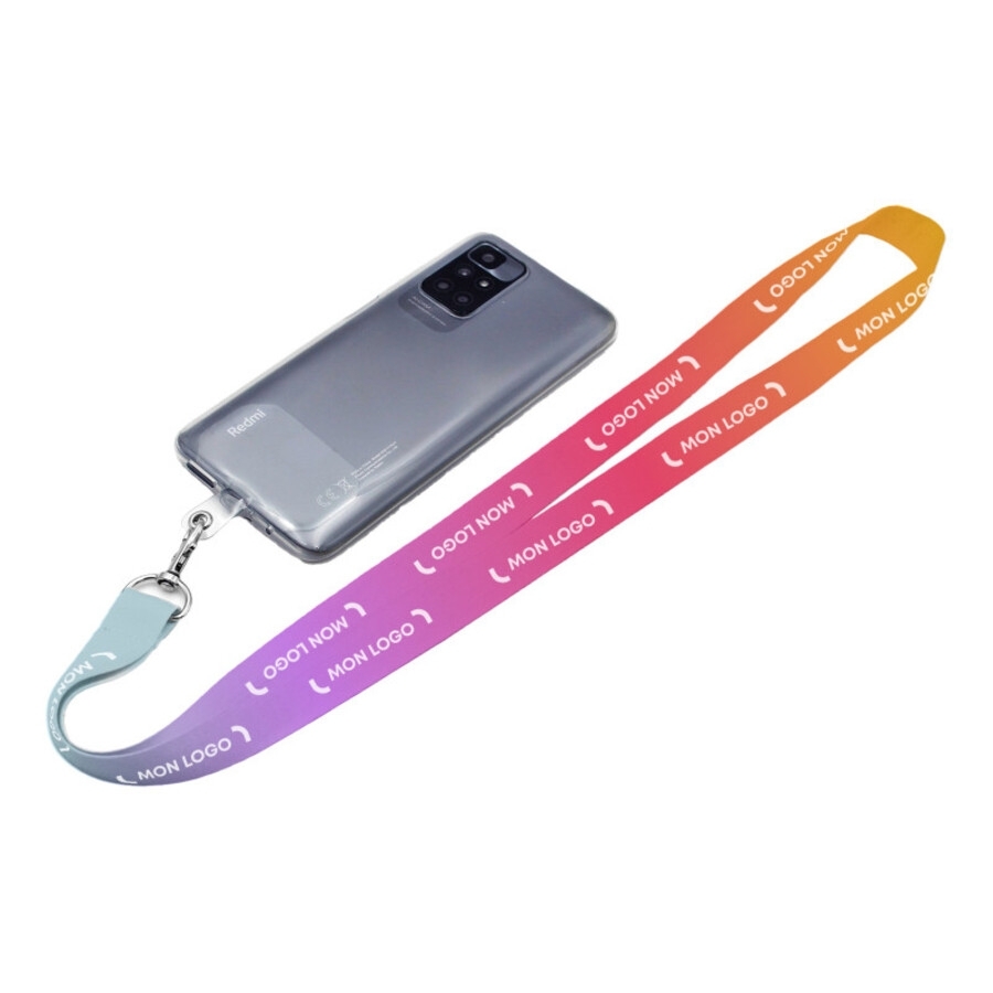 Lanière en polyester. Mousqueton et patch pour téléphone inclus.