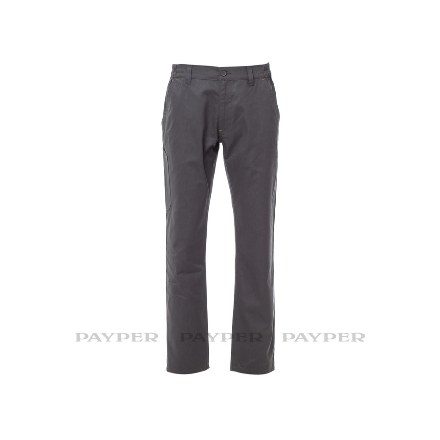 Pantalon en twill sanforisé de coton, avec passants et élastique à la taille. Fermeture par zip et bouton. Deux poches de coupe classique sur le devant ; un porte-mètre latéral sur la jambe droite. Une poche arrière avec rabat et fermeture autoagrippante. Coutures triple piqûre.