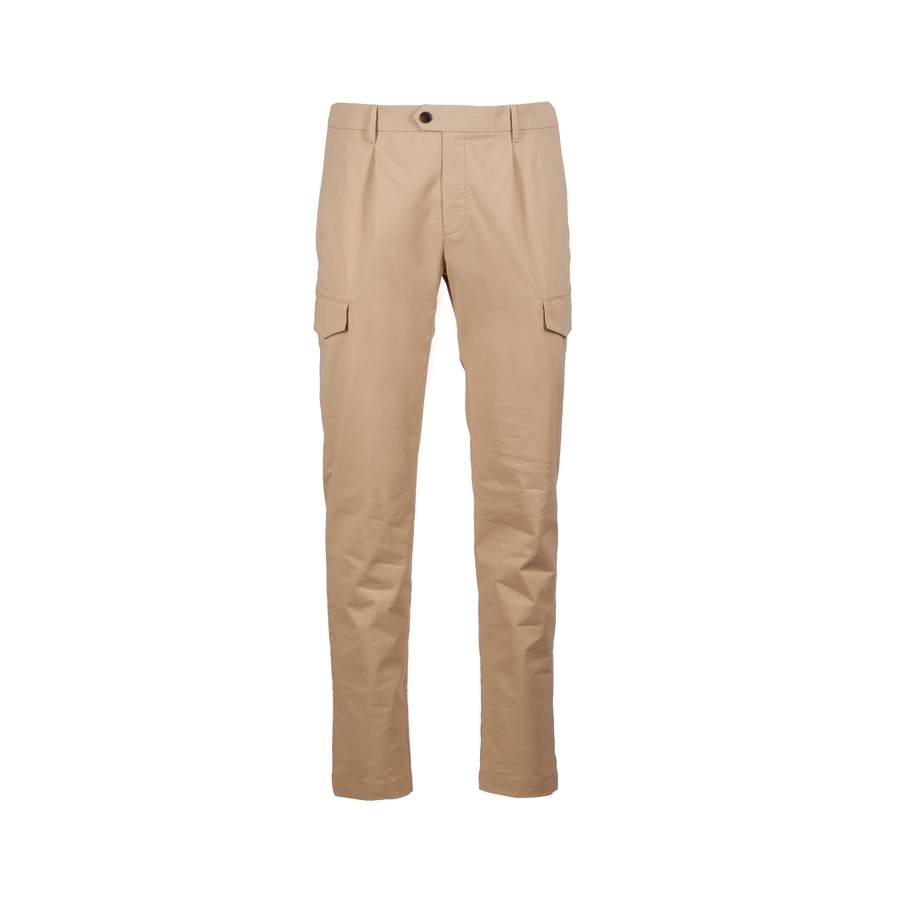 Pantalon chino, en gabardine stretch, coupe contemporaine, avec passants de style sartorial, fermeture par zip, patte de boutonnage décalée avec bouton apparent et bouton intérieur. 2 petites pinces sur le devant. 2 poches cavalières, 2 poches latérales avec rabat et bouton-pression caché, 2 poches arrière avec rabat et bouton-pression. Rivet en forme d'hélice sur le côté droit.
