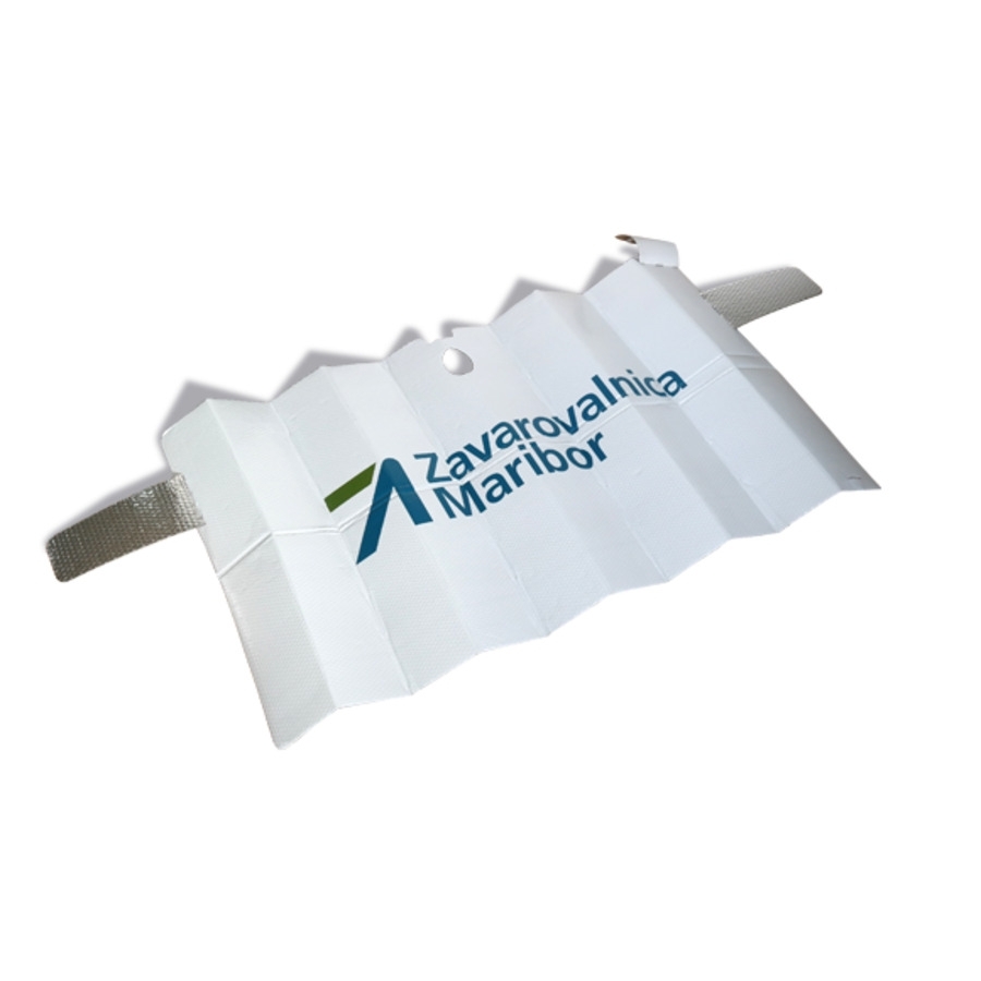 Pliable pour rangement facile, fermeture par bouton pression, 2 faces Pet aluminé + fabriqué à partir de 80% de plastique recyclé, 280gr/m2 + encres et vernis de haute résistance aux U.V.