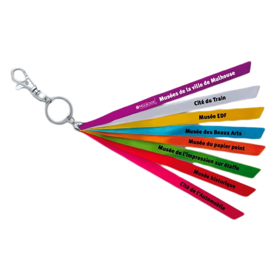 Porte-clés qui se composent de 8 rubans de différentes couleurs (rouge, rose, vert, orange, bleu, jaune, blanc, violet).
