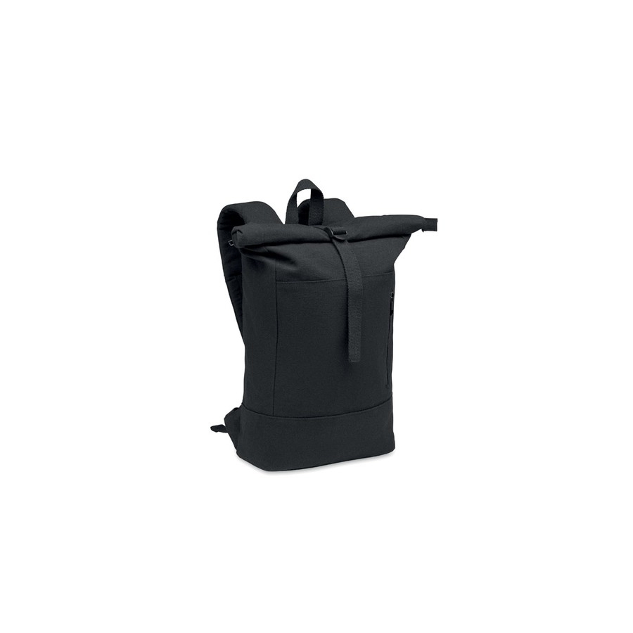 Sac à dos à ftop enroulable zippé pour ordinateur portable de 15 pouces en coton recyclé de préconsommation et polyester recyclé (70 %/30 %). Poche frontale zippée. Dos et bretelles rembourrés. 340gr/m².
