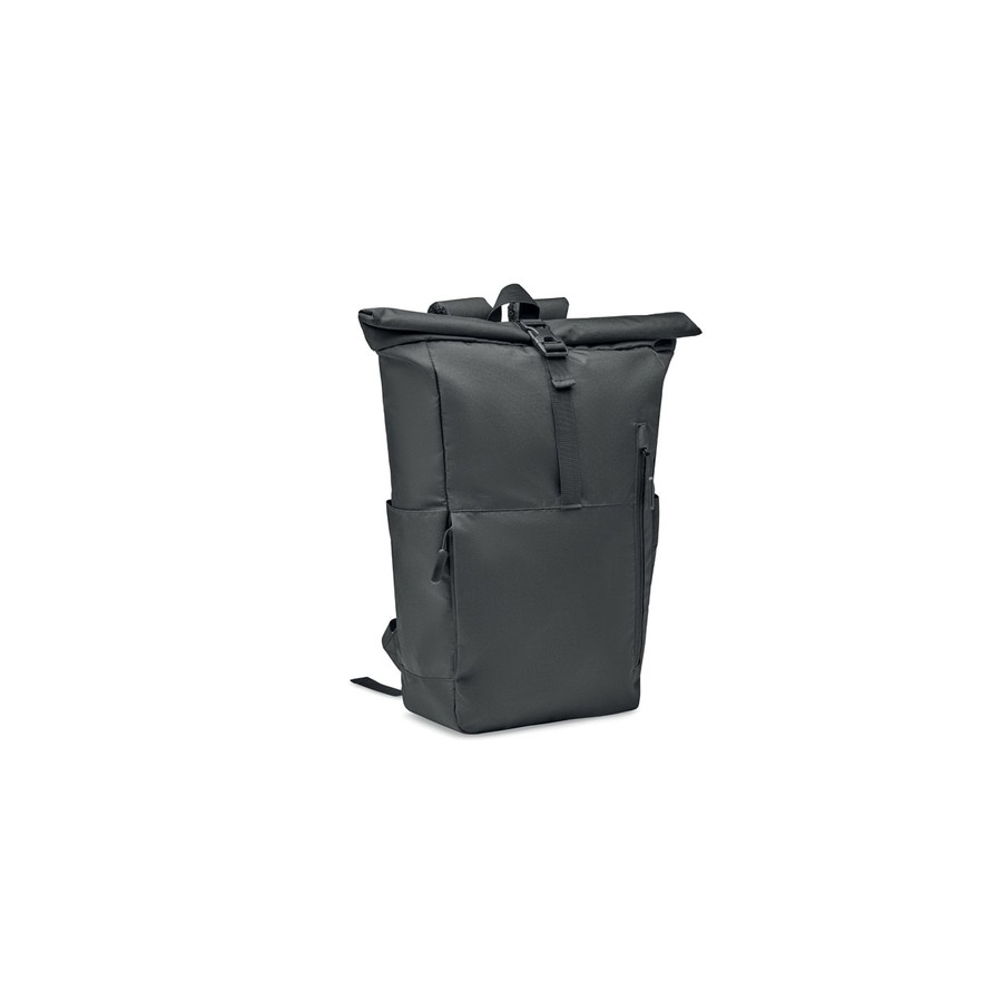 Sac à dos fermeture enroulable pour ordinateur portable de 15 pouces en polyester 300D RPET. Grande poche frontale zippée et une poche latérale secrète avec mousqueton à l'intérieur.