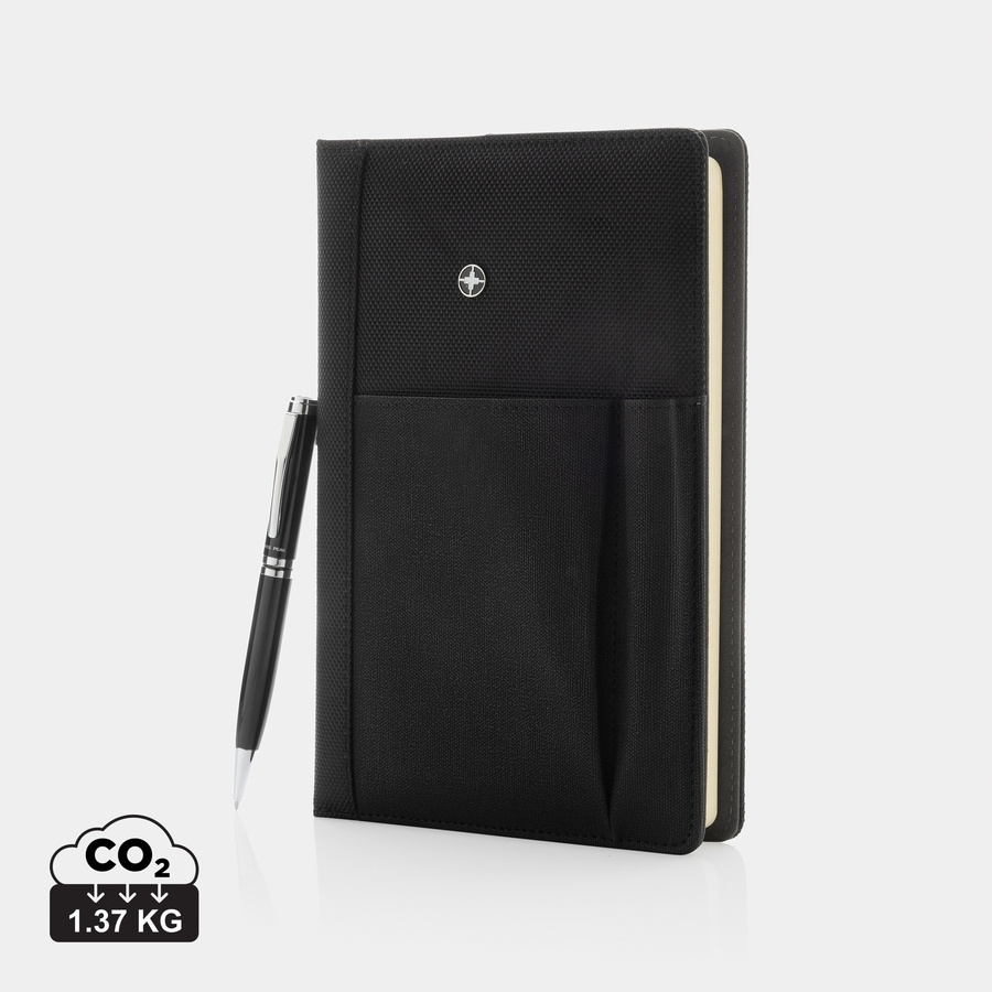 Carnet de notes A5 avec housse en polyester 1680D et 600D et stylo. Pochette à téléphone , rangement stylo et pour cartes de visite. La housse peut être réutilisée avec un autre carnet A5 avec 96 feuilles/192 pages 80g/m². Emballé dans une boite cadeau Swiss Peak.