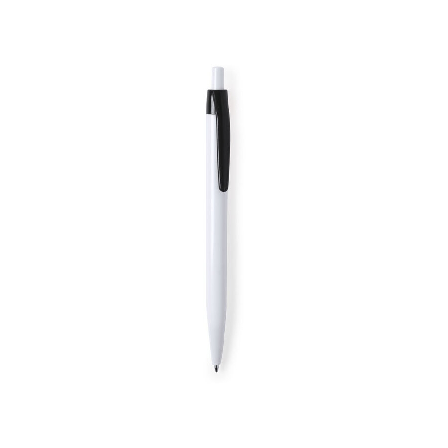 Stylo à bille poussoir avec un design bicolore . Corps blanc et clip de couleurs variées. Large surface d'impression et recharge d'encre bleue.