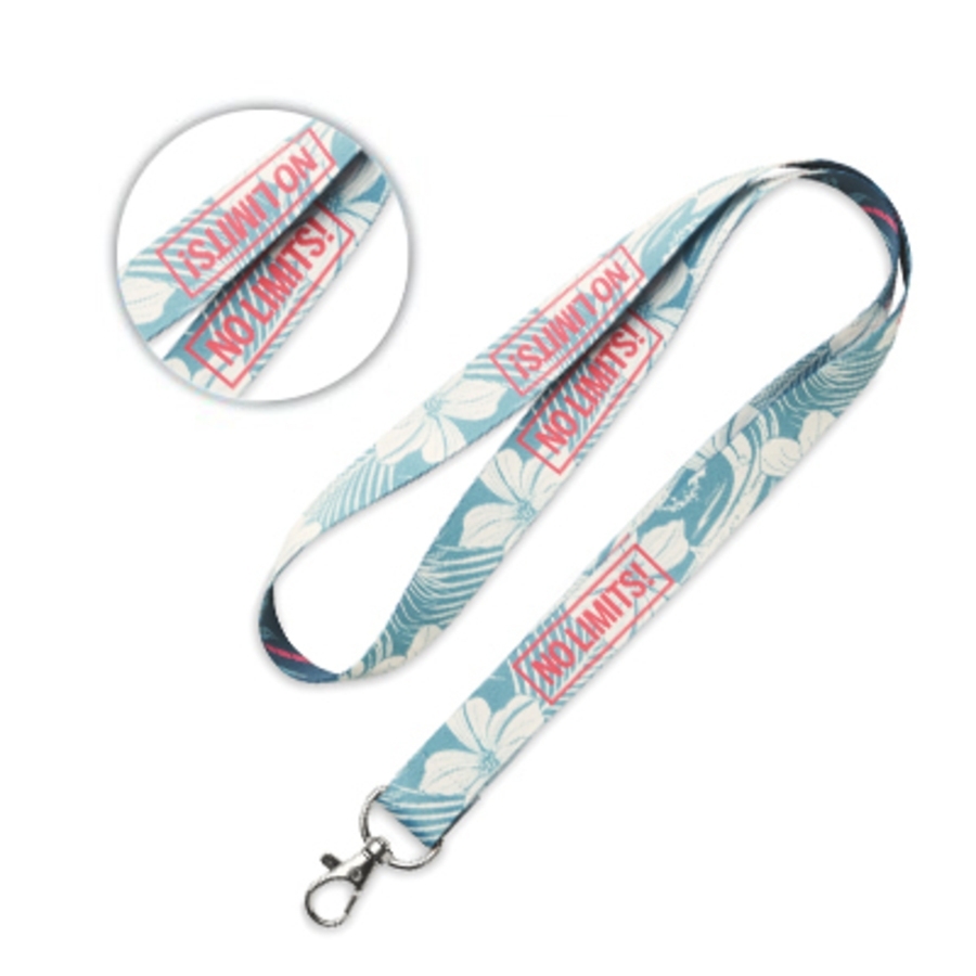 Les rubans d'env. 90 cm sont imprimés par sublimation en quadri pour tous les motifs uniques et les images photographiques ; imprimés sur une ou deux faces. Le lanyard est coupé sur mesure après impression et le positionnement du logo au dos de l'article peut être différent pour chaque foulard. Il est donc recommandé d'utiliser des motifs répétés, non positionnés, pour le dos.